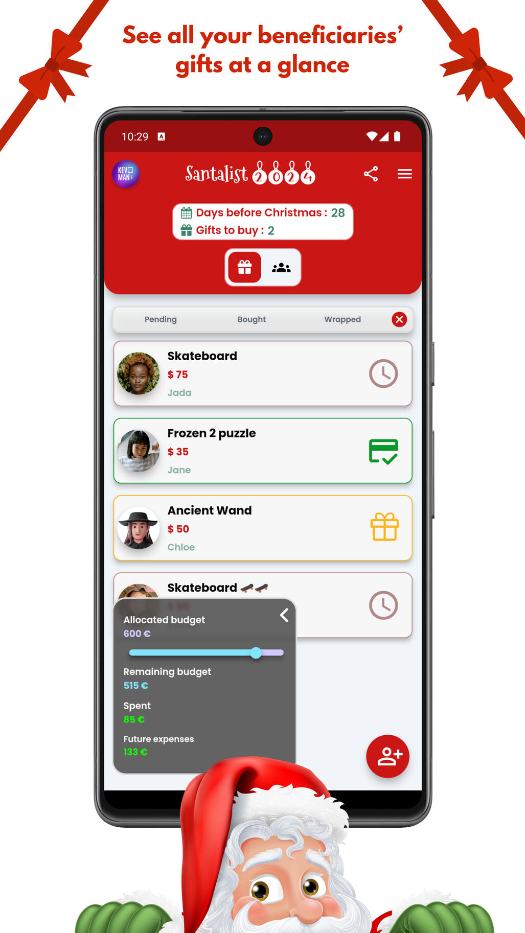 Get your Christmas shopping done hassle-free with SantaList.Designed to help you organize your xmas gift lists, manage your budget, and track the progress of your purchases for each recipient, this intuitive app will guide you through the holiday season.